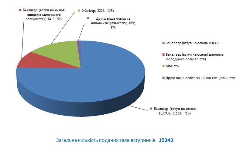Найбільше заяв отримано від абітурієнтів, які вступають на основі повної загальної середньої освіти – 11 553. За першим пріоритетом подано 2583 заяви вступників, оригіналами підтверджено 2122 заяви.