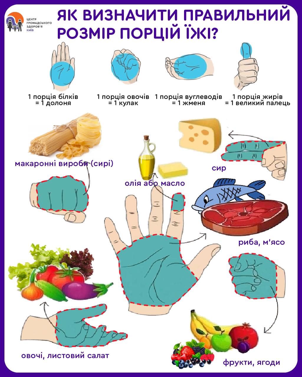 Тарілка здорового харчування та рекомендації з її використання містять поняття порції. Аби було легше зорієнтуватися та зрозуміти, що таке порція, використайте кисть руки. Дана порада є корисною як для дорослих, так і для дітей. Звісно, дитяча порція повинна бути меншою, адже розмір руки в дитини теж менший.