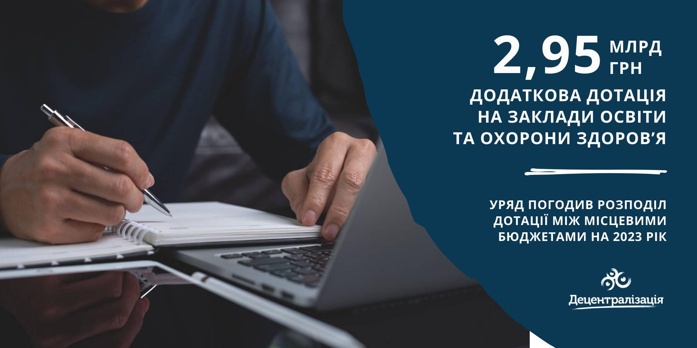 У Державному бюджеті України на 2023 рік передбачено кошти на додаткові дотації місцевим бюджетам у загальній сумі 3,7 млрд гривень. З цієї суми понад 2,9 млрд грн буде спрямовано для забезпечення належного утримання закладів освіти та охорони здоров’я на місцевому рівні.