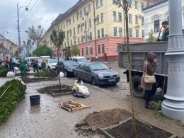 У центрі Чернівців на вулиці Головній садять 8 сакур. Ними замінили туї, які раніше росли на цьому місці.