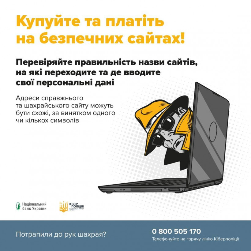Для онлайн-шопінгу кіберполіція рекомендує використовувати перевірені сайти, а інформацію щодо соціальних виплат отримувати лише з офіційних сторінок державних органів.
