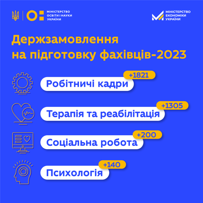 Зокрема, у 2023 році збільшується державне замовлення на підготовку робітничих кадрів – на 1821 особу, соціальних працівників – на 200 осіб, психологів та медичних психологів – на 140 осіб, фахівців за спеціальністю «Терапія та реабілітація» – на 1305 осіб.
