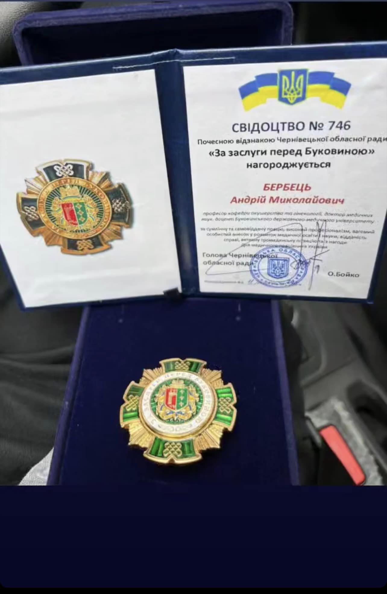 Військового медика, доктора медичних наук і викладача катедри акушерства й гінекології Буковинського державного медичного університету Андрія Бербеця нагородили почесною відзнакою Чернівецької обласної ради «За заслуги перед Буковиною».