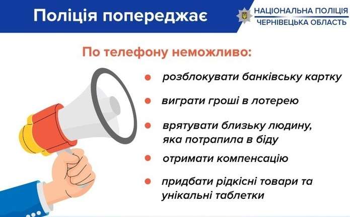 Протягом минулої доби на спецлінію «102» надійшло три повідомлення від буковинців про те, що невідомі особи незаконно заволоділи їхніми коштами. При цьому порушники використовували різні схеми виманювання грошей. За вказані дії зловмисникам загрожує до трьох років обмеження волі. Про це повідомляє відділ комунікації поліції Чернівецької області.