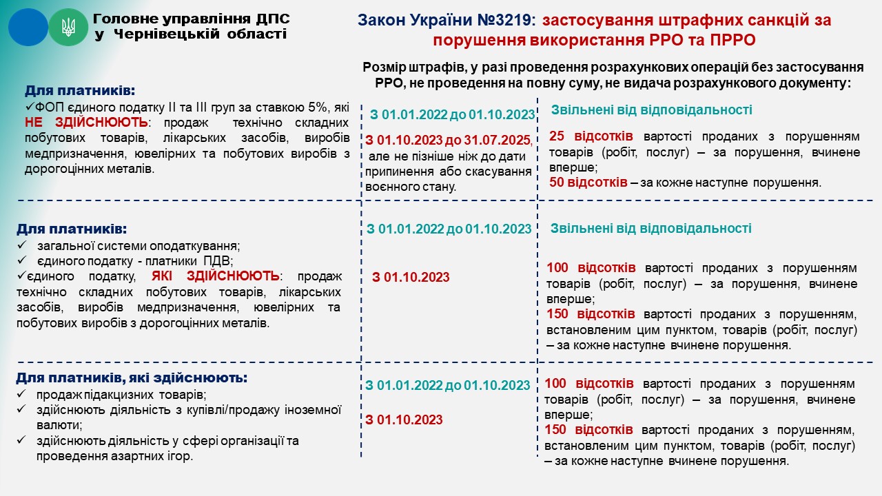 У зв’язку з прийняттям Закону України від 30 червня 2023 року № 3219-IX «Про внесення змін до Податкового кодексу України та інших законів України щодо особливостей оподаткування у період дії воєнного стану» (далі – Закон № 3219) у Головному  управлінні ДПС у Чернівецькій області про особливості відновлення відповідальності за порушення вимог Закону України «Про застосування реєстраторів розрахункових операцій у сфері торгівлі, громадського харчування та послуг» (далі – Закон № 265) підготували для вас коротке роз’яснення .
