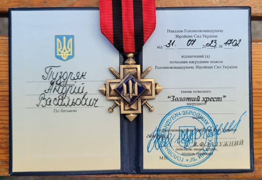 Учасник бойових дій з 2014 року, голова асоціації ветеранів «За Україну. За її волю», депутат Чернівецької обласної ради Андрій Пуздряк отримав почесний нагрудний знак «Золотий хрест».