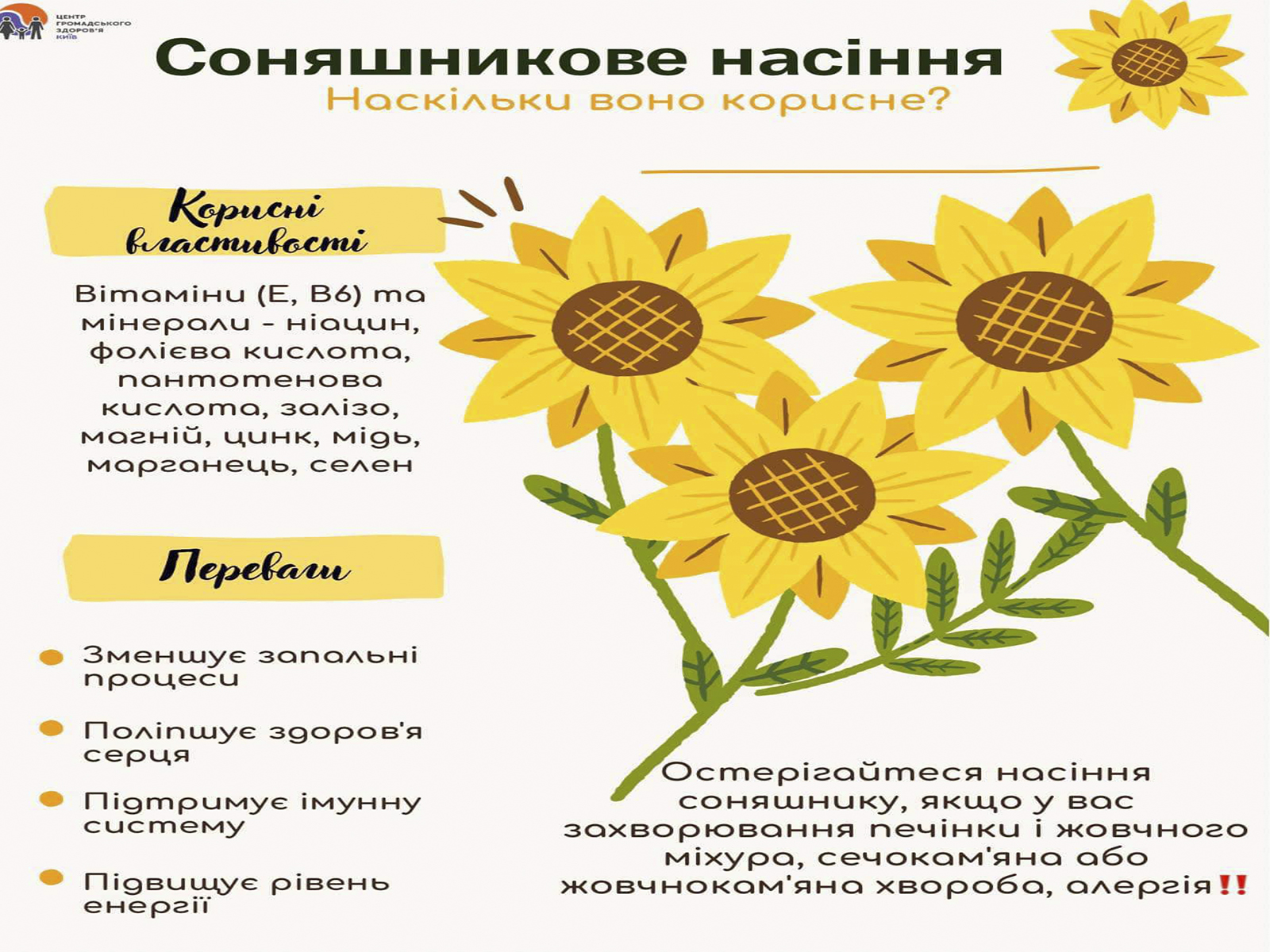 Соняшники багаті на корисні жири, рослинні сполуки, а також деякі вітаміни (Е, B1, В6) та мінерали – ніацин, фолієва кислота, пантотенова кислота, залізо, магній, цинк, мідь, марганець, селен, які здатні відіграти неабияку роль у зниженні ризику виникнення поширених проблем зі здоров’ям, у т.ч. хвороб серця та діабету II типу.