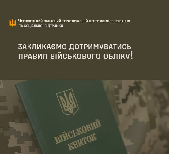- Військовозобов’язані чоловіки, які прибули в Чернівецьку область для проживання з інших регіонів, повинні в семиденний термін звернутись до ТЦК та СП і стати на військовий облік.