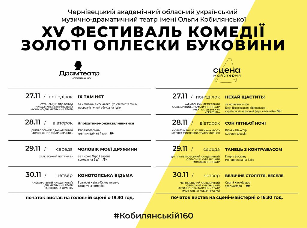 У Чернівецькому обласному музично-драматичному театрі імені Ольги Кобилянської оприлюднили афішу фестивалю «Золоті оплески Буковини», який відбудеться 27-30 листопада.