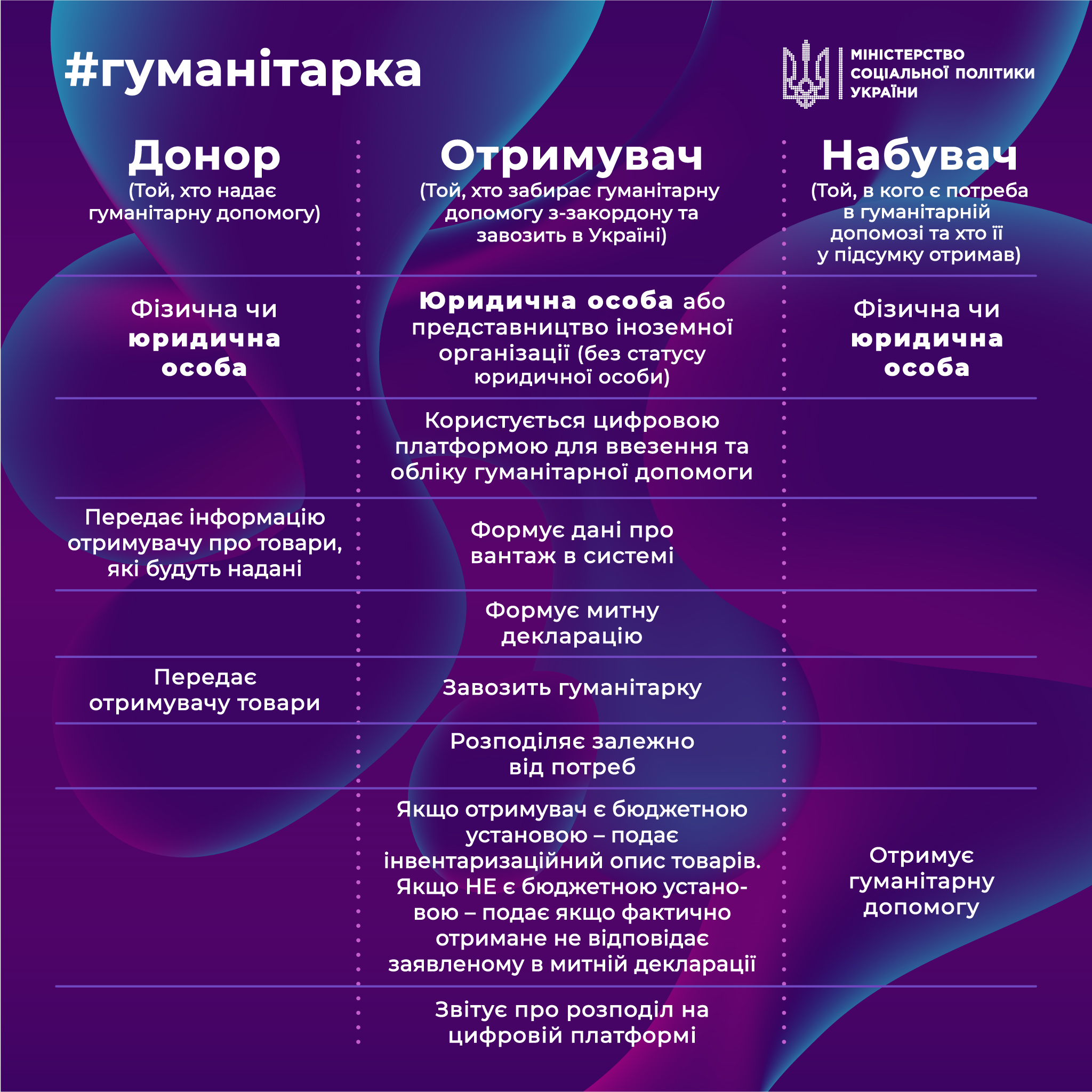 Важливо наголосити, що чинне законодавство передбачає реєстрацію отримувача в Єдиному реєстрі отримувачів гуманітарної допомоги. До прикладу, – це благодійні фонди, громадські організацій, реабілітаційні установи.