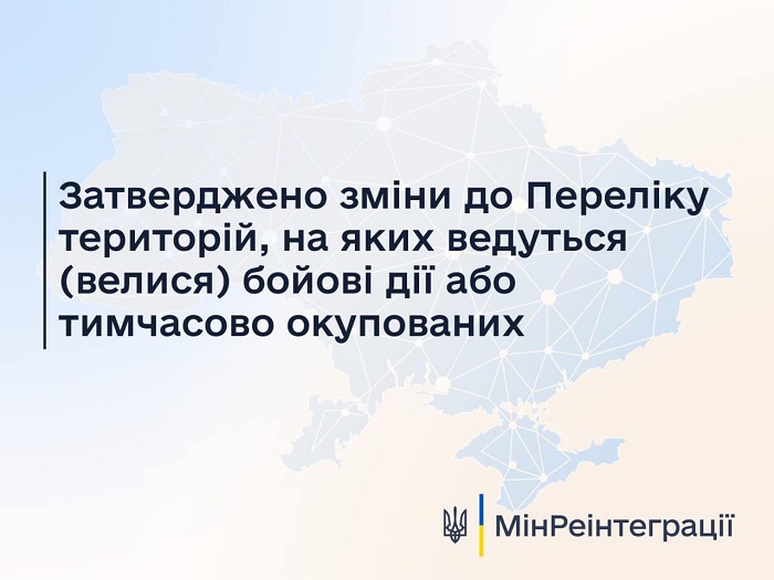 Наказом Мінреінтеграції від 20 грудня 2023 року № 363 внесено зміни до Переліку територій, на яких ведуться (велися) бойові дії або тимчасово окупованих російською федерацією – https://minre.gov.ua/wp-content/uploads/2024/01/perelik_zatverdzhenyj_nakazom_363_nakaz_vid_20_grudnya_2023.pdf?fbclid=IwAR35rHZDl2-Ta2qOw7F0MB5_UZTQWSzHfNCVcXmm2XS60cteyaxMCzPHkrA