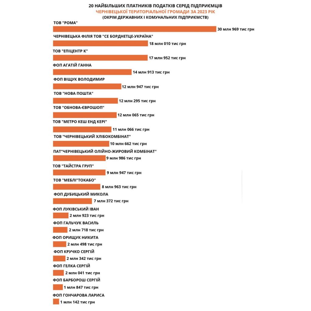 Найбільшим платником податків серед підприємців Чернівецької громади за 2023 рік (окрім державних і комунальних підприємств) є ТОВ «Рома». Торік фірма сплатила до міського бюджету 30 мільйонів 969 тисяч гривень.