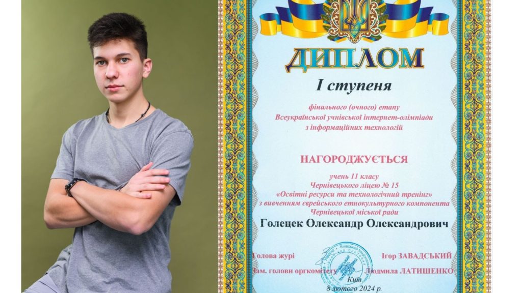 Учень 11 класу Чернівецького ліцею №15 Олександр Голецек став переможцем Всеукраїнської учнівської інтернет-олімпіади з інформаційних технологій.