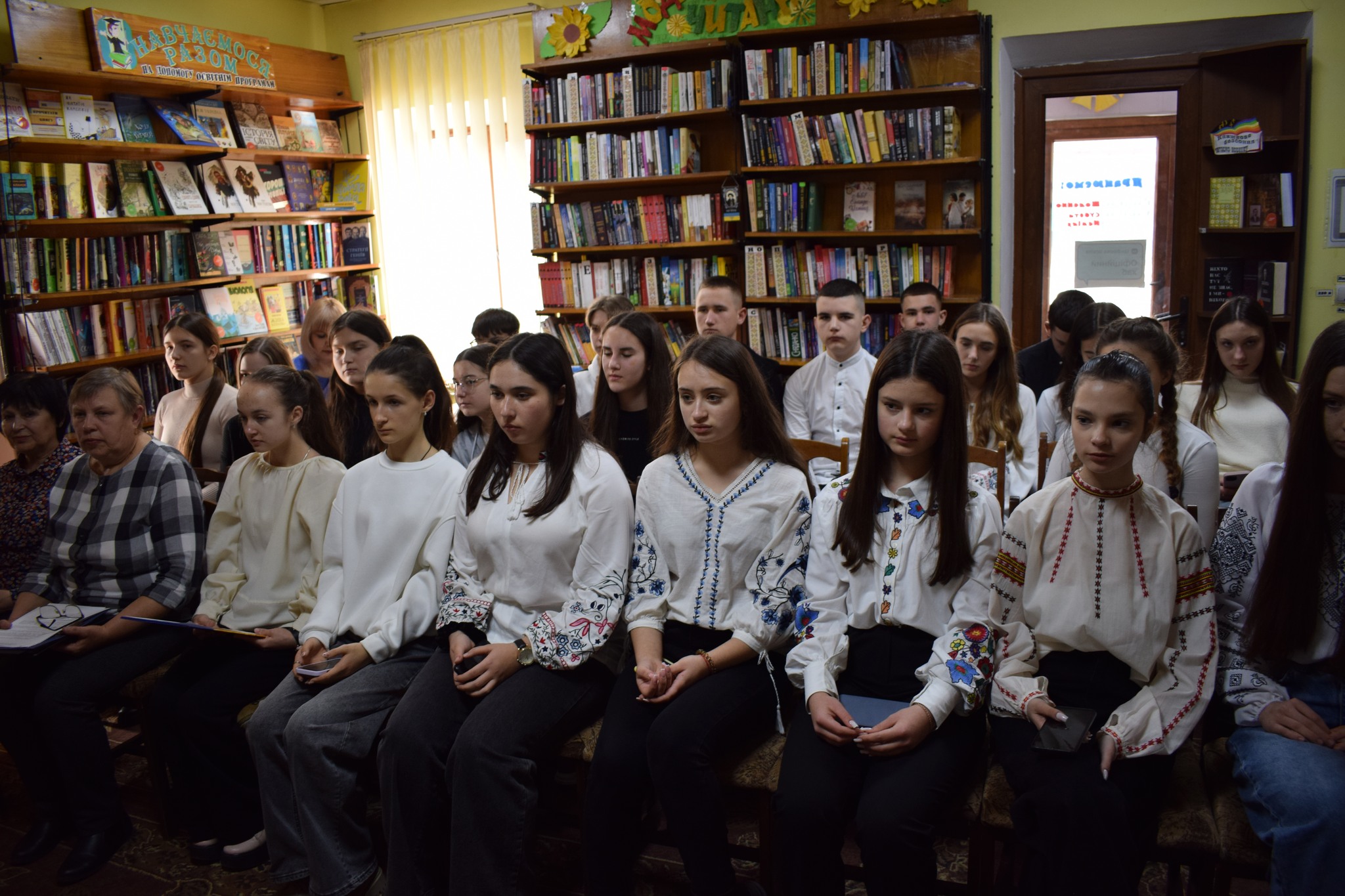 На зустріч завітали учні опорного закладу «Сокирянський ліцей №1» спільно із вчителем Валентиною Мельник; місцева поетеса, член Національної спілки журналістів України – Галина Будняк; активна читачка бібліотеки, поетеса, яка знайшла домівку на Сокирянщині у зв’язку із воєнними діями, внутрішня переселенка – Галина Скрипник; працівники бібліотеки.
