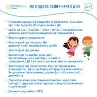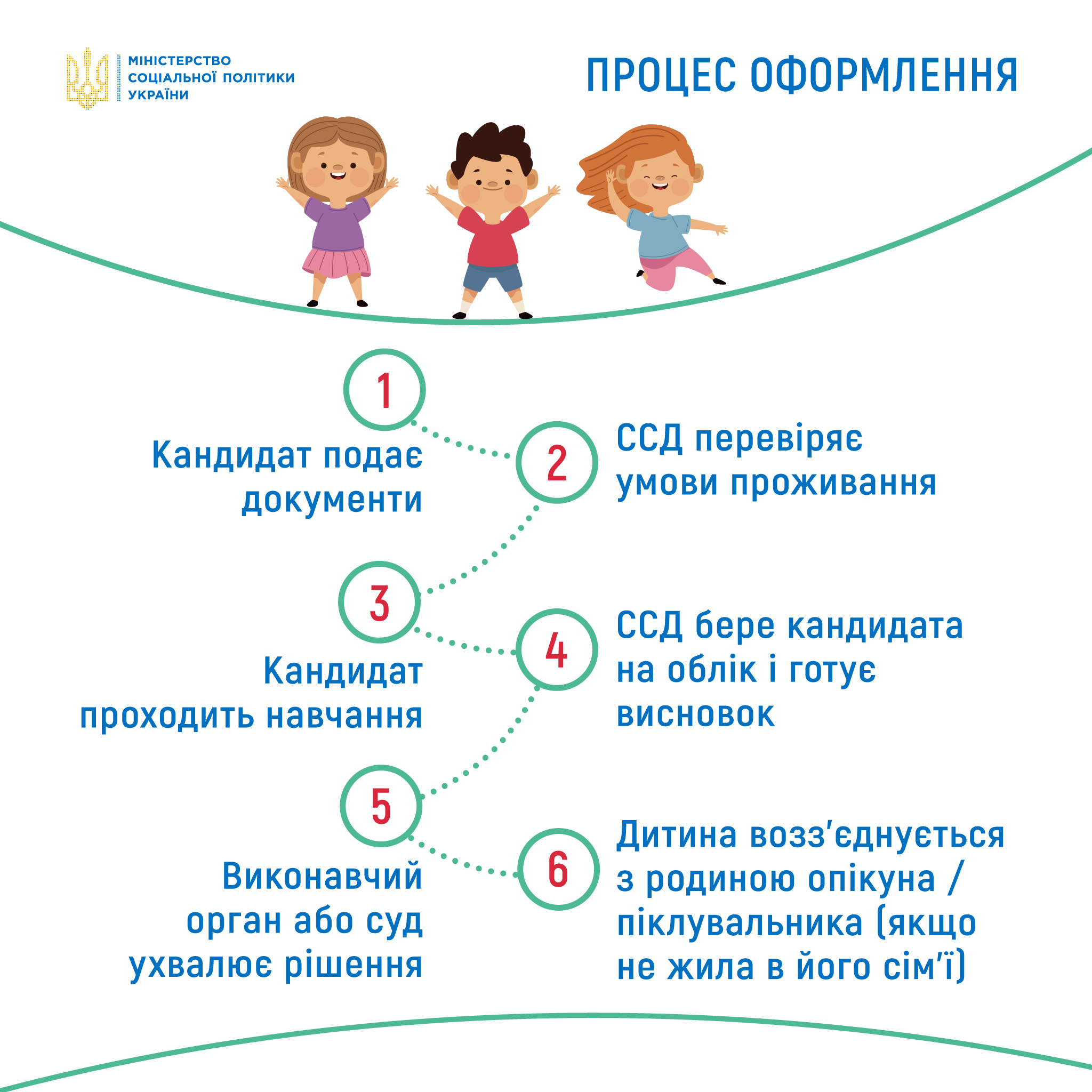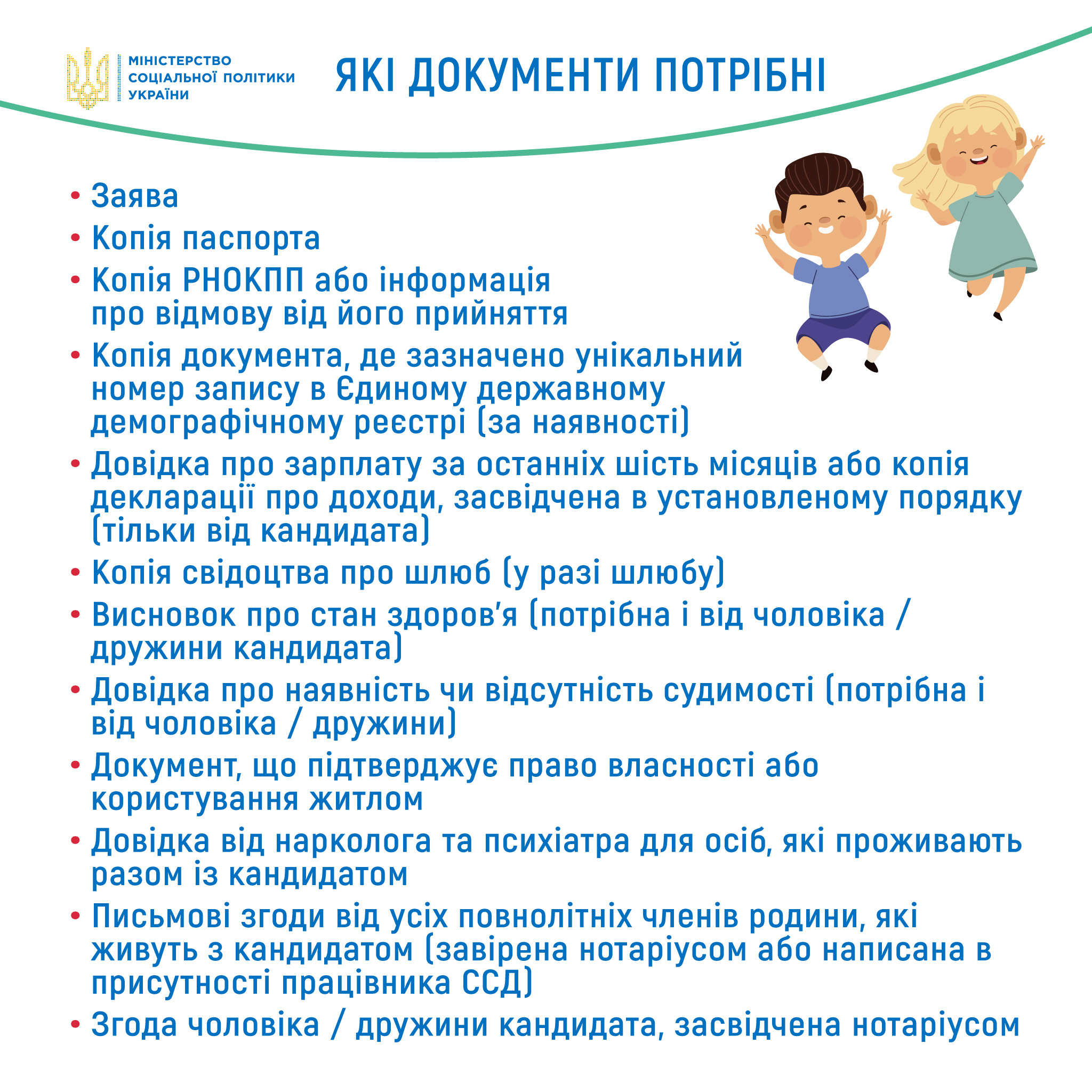 Кандидат подає заяву і документи через Дію або в Службу у справах дітей (ССД).