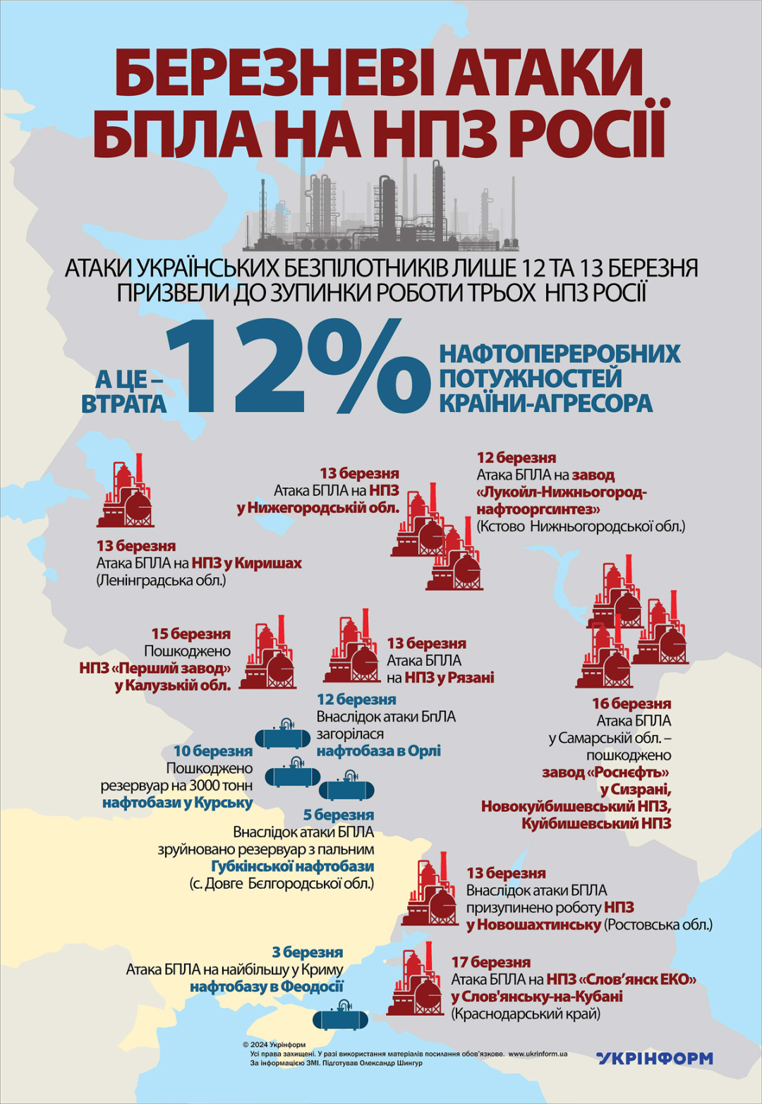 Атаки українських безпілотників лише 12 та 13 березня призвели до зупинки роботи трьох  НПЗ Росії