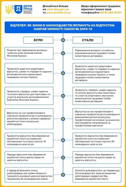 Закон України №3494-ІХ «Про внесення днів до деяких законодавчих актів України щодо впорядкування надання та використання відпусток, а також інших питань» набрав чинності наприкінці грудня минулого, 2023, року. Цим нормативно-правовим актом внесено суттєві зміни у чинне законодавство.