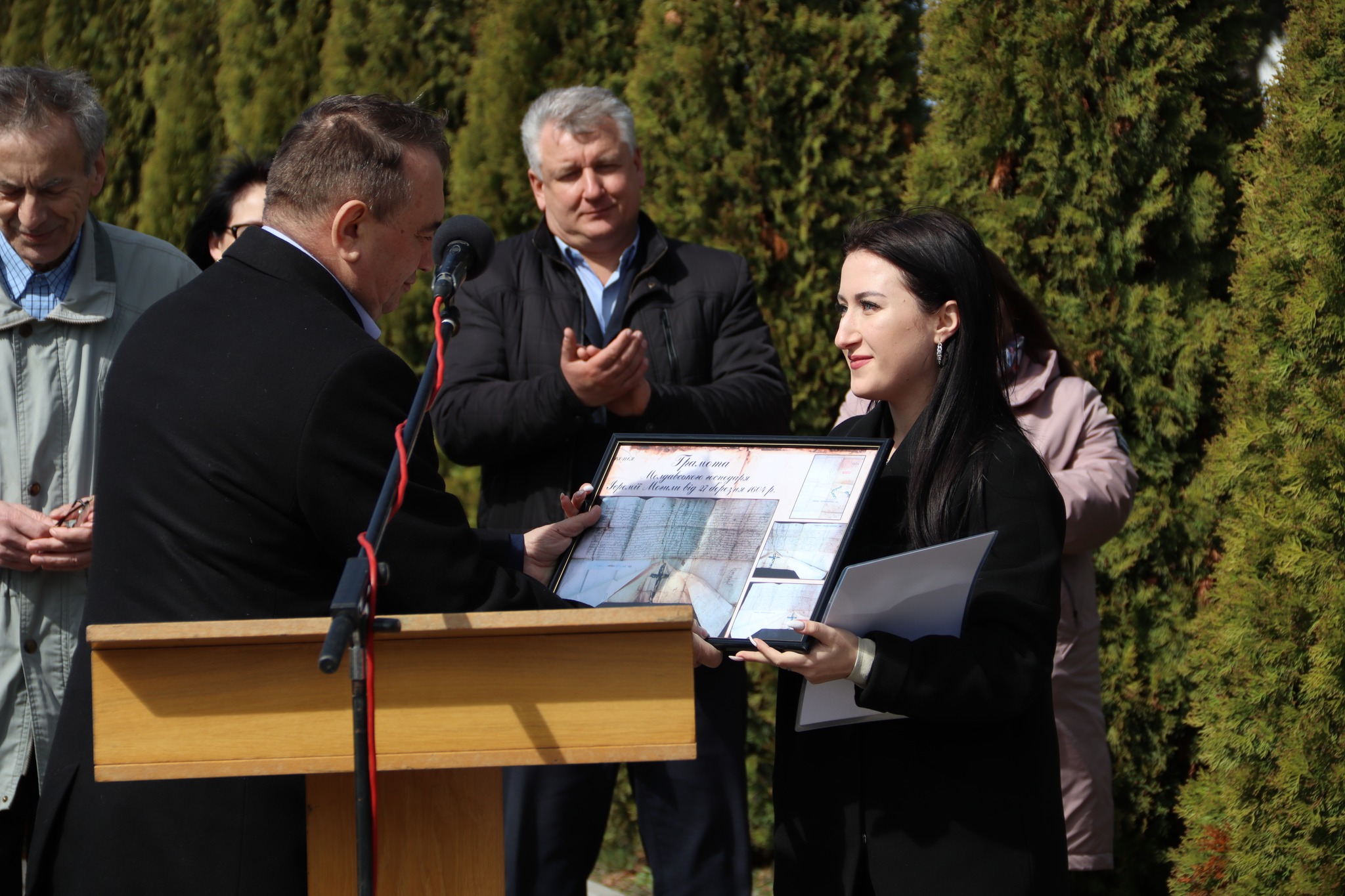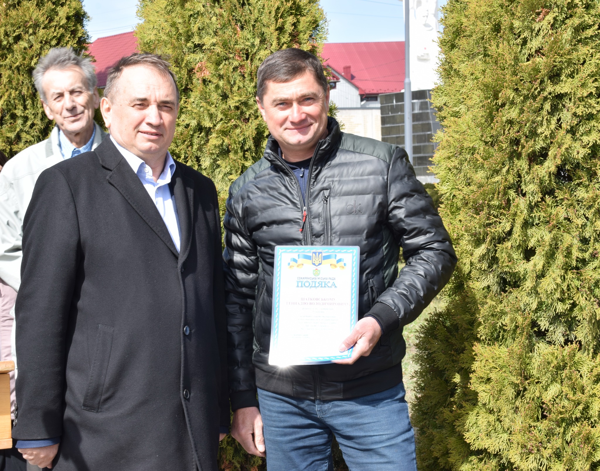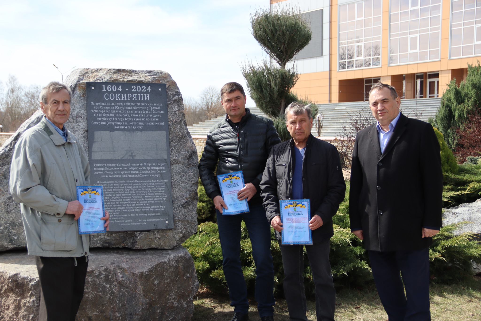Міський голова вручив Подяки Сокирянської міської ради тим, хто доклав зусиль та рук для спорудження пам’ятного знаку – краєзнавцю Олександру Чорному, колективу КП «Сокиряни-благоустрій» та підприємцю Геннадію Шатковському.