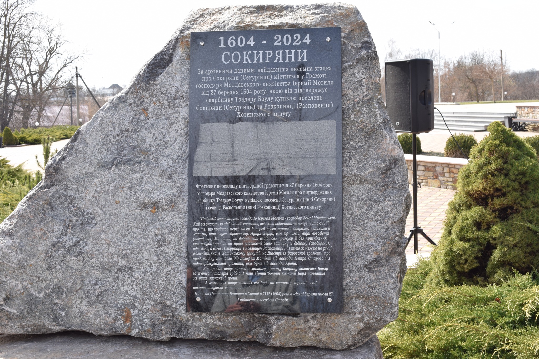 Відкриття монументу відбулось 27 березня. За архівними даними, а саме на підставі грамоти господаря Молдовського князівства Ієремії Могили, перша писемна згадка про поселення Сокиряни (Секуринці, як зазначається в грамоті) датована саме 27 березня 1604 року. Тобто саме сьогодні, якщо починати відлік з 1604 року, виповнюється 420 років з того дня, коли в історичних документах вперше було внесено відомості про місто Сокиряни.