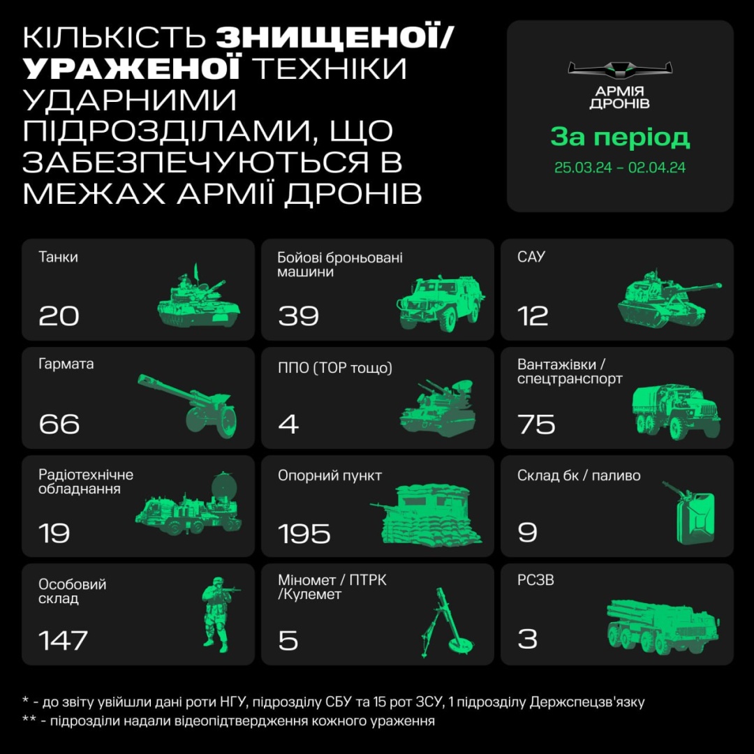 Крім того, за допомогою БПЛА у період з 25 березня по 2 квітня було виведено з ладу 19 одиниць радіотехнічного обладнання, 75 вантажівок, 12 САУ. А також наші підрозділи уразили 147 ворожих солдат.