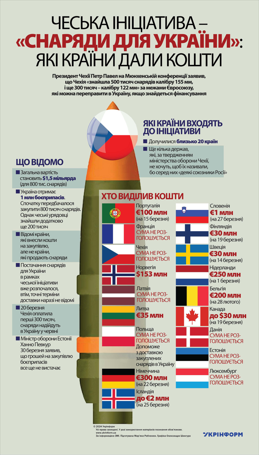 Президент Чехії Петр Павел на Мюнхенській конференції заявив, що Чехія «знайшла 500 тисяч снарядів калібру 155 мм, і ще 300 тисяч – калібру 122 мм» за межами Євросоюзу, які можна переправити в Україну, якщо знайдеться фінансування