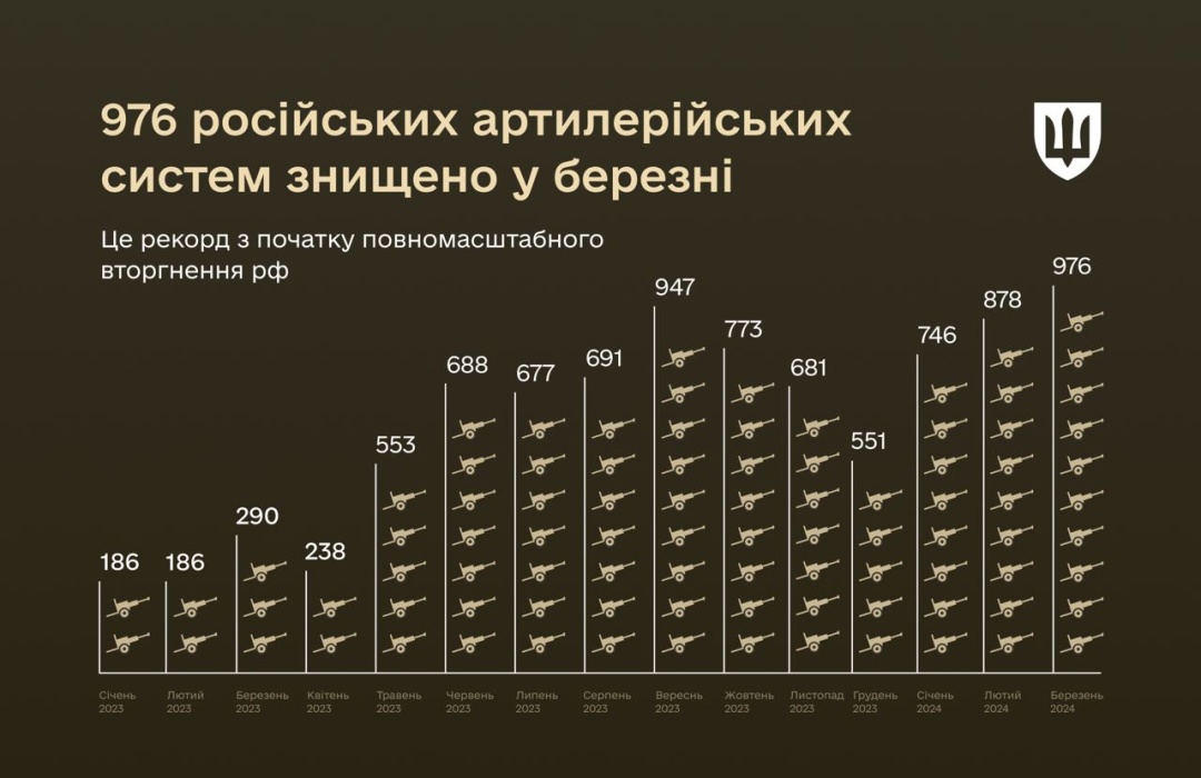 «У березні 2024 року Сили оборони України знищили 976 російських артилерійських систем. Це – найвищий показник за один місяць від початку повномасштабного вторгнення», – йдеться в повідомленні.