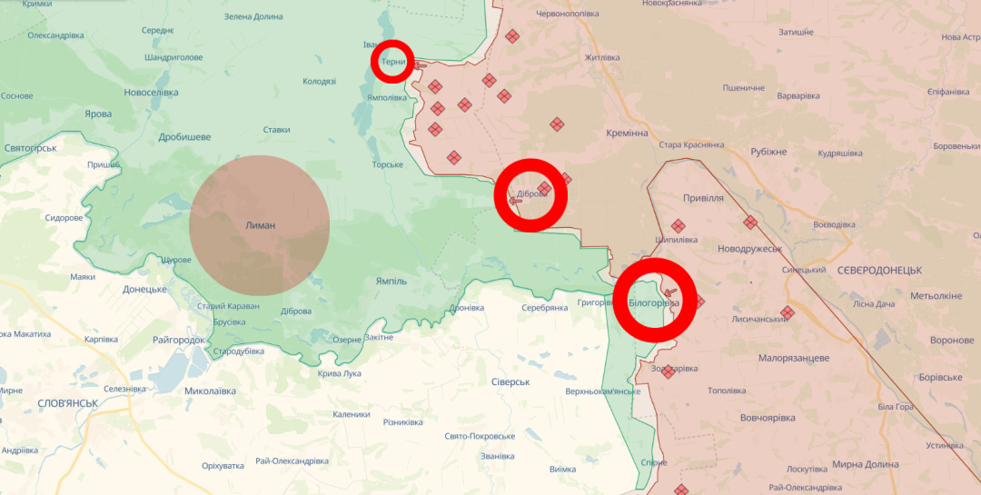 Так само безуспішні просування окупантів під Лиманом (захоплення цього міста відкрило б ворогу шлях на Слов'янсько-Краматорську агломерацію з півночі, – Ред.). — поблизу н.п. Терни, Діброва та Білогорівка.