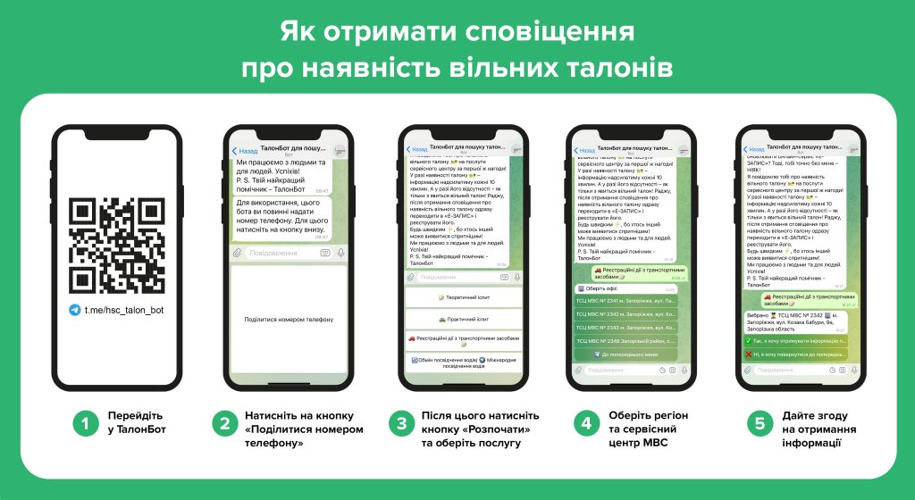 Для отримання сповіщення про наявність вільних талонів, для початку необхідно перейти у ТалонБот. Потім надати номер телефону — натиснути кнопку «Поділитися номером телефону». Після цього натиснути кнопку «Розпочати» та обрати послугу. Якщо Ви обрали «реєстраційні дії з транспортними засобами», далі потрібно визначитися з регіоном та сервісними центрами, де хочете отримати послугу. У разі наявності вільного талону система автоматично надсилає повідомлення кожні 10 хвилин в телеграм. Після отримання сповіщення про вільний час на запис потрібно перейти за посиланням в Е-Запис та взяти талон на отримання послуги.