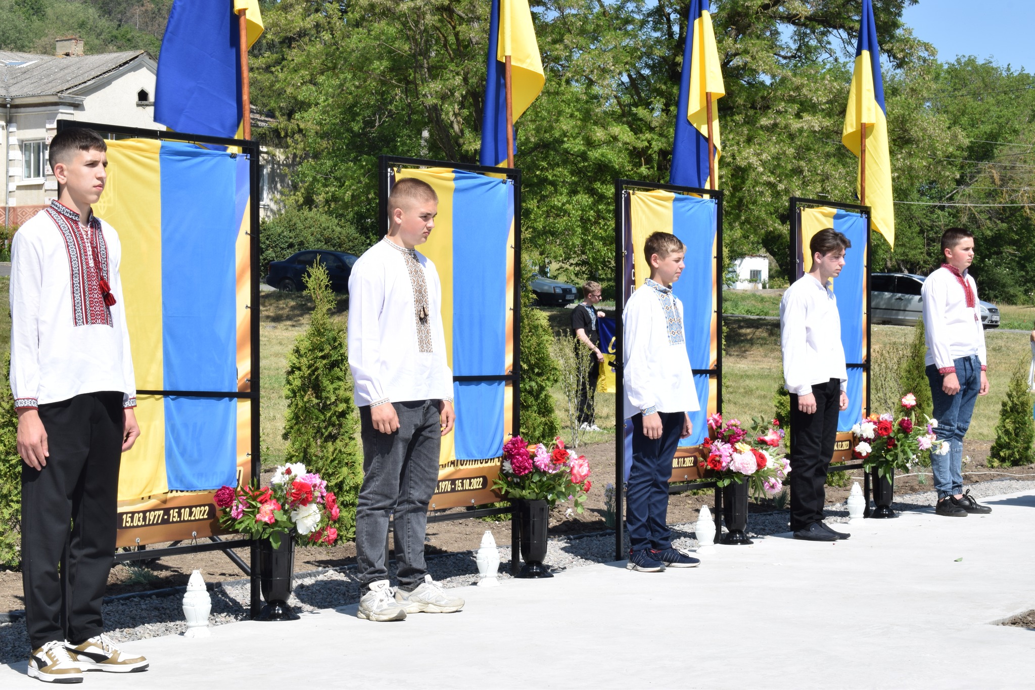 Лягли живі квіти до портретів Олега Манкевича, Олексія Гимлюка, Андрія Малованюка, Миколи Стародуба – у селі Ожеве.