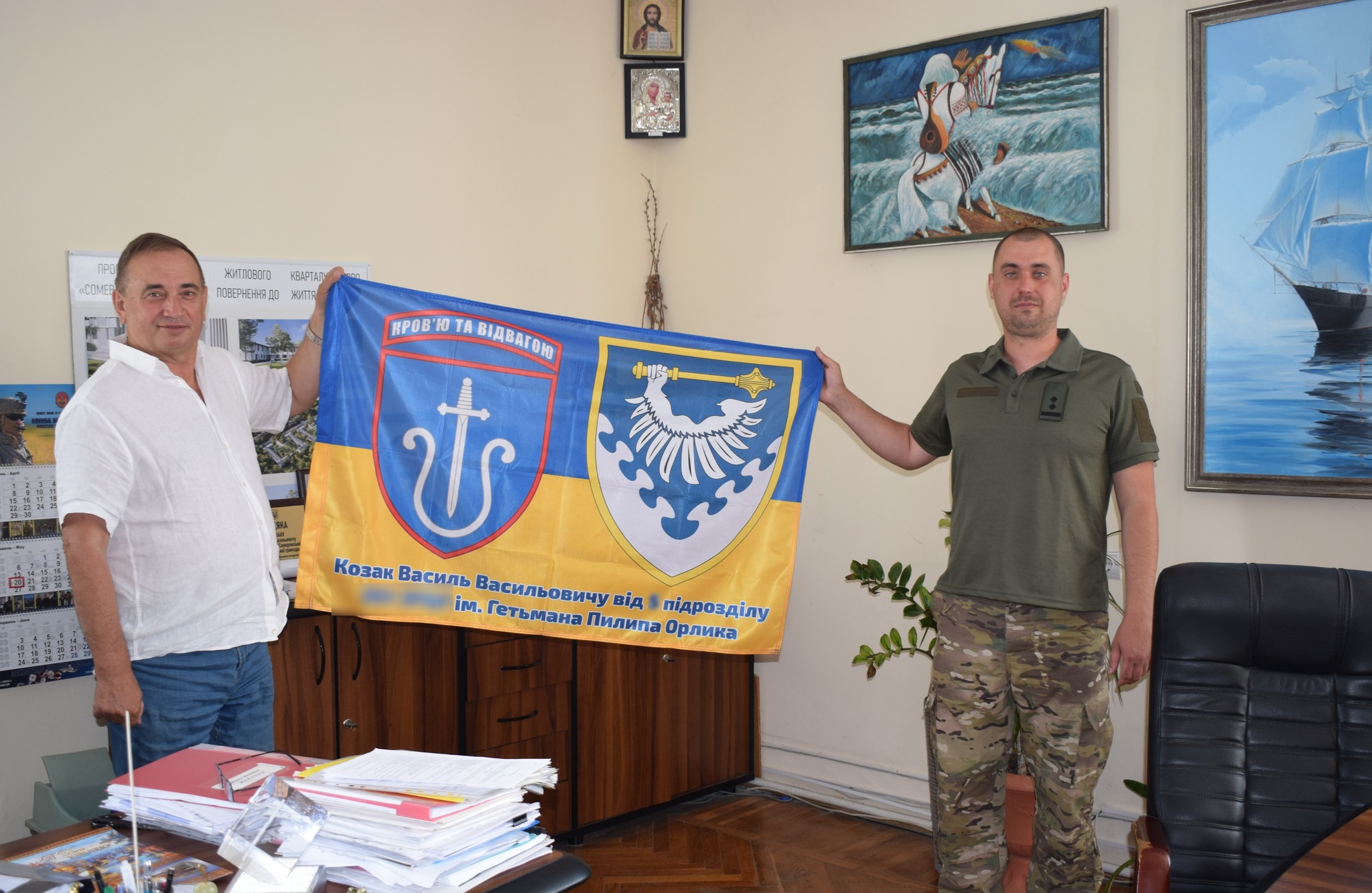 Експонат передав військовий родом не із Сокирянщини, який вже не вперше побував у нашому краї. Захисник вручив прапор міському голові Василю Козаку та подякував за підтримку української армії.