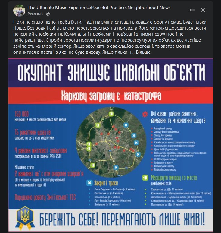• таргетованої Facebook-реклами з фейками про «перекриття виїздів з Харкова», «здачу» міста, його «приреченість», «масову втечу харків’ян», «таємну евакуацію влади» тощо;