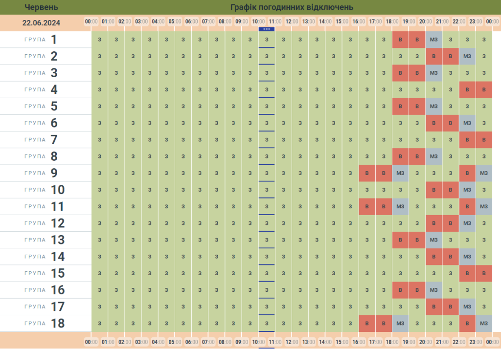 Як зазначають в обленерго, у графіку погодинних відключень відображаються години гарантованого включення електроенергії (зелені клітинки) та години, коли ваші оселі будуть точно знеструмлені (позначені червоним кольором).
