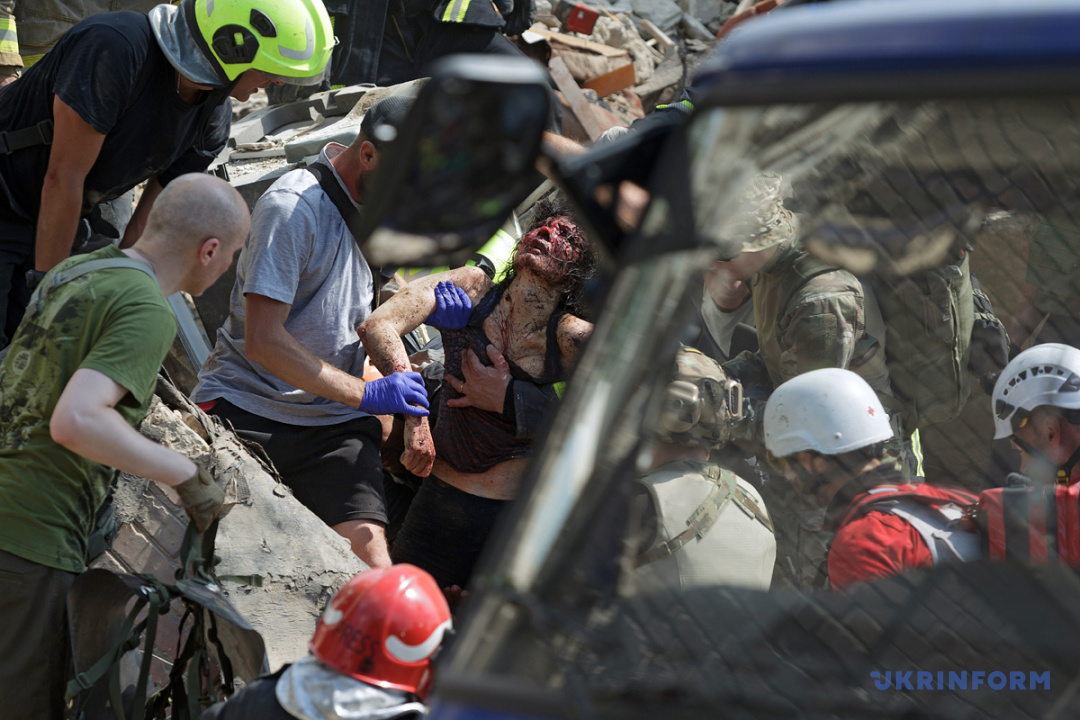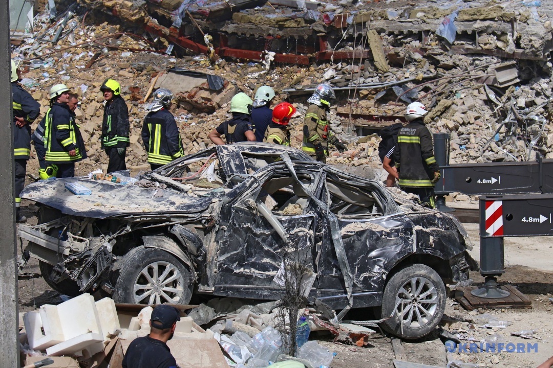 На місці розбирання завалів, до якого після перших хвилин влучання долучалися і небайдужі цивільні, працює важка інженерна техніка, тривають пошуково-рятувальні роботи.