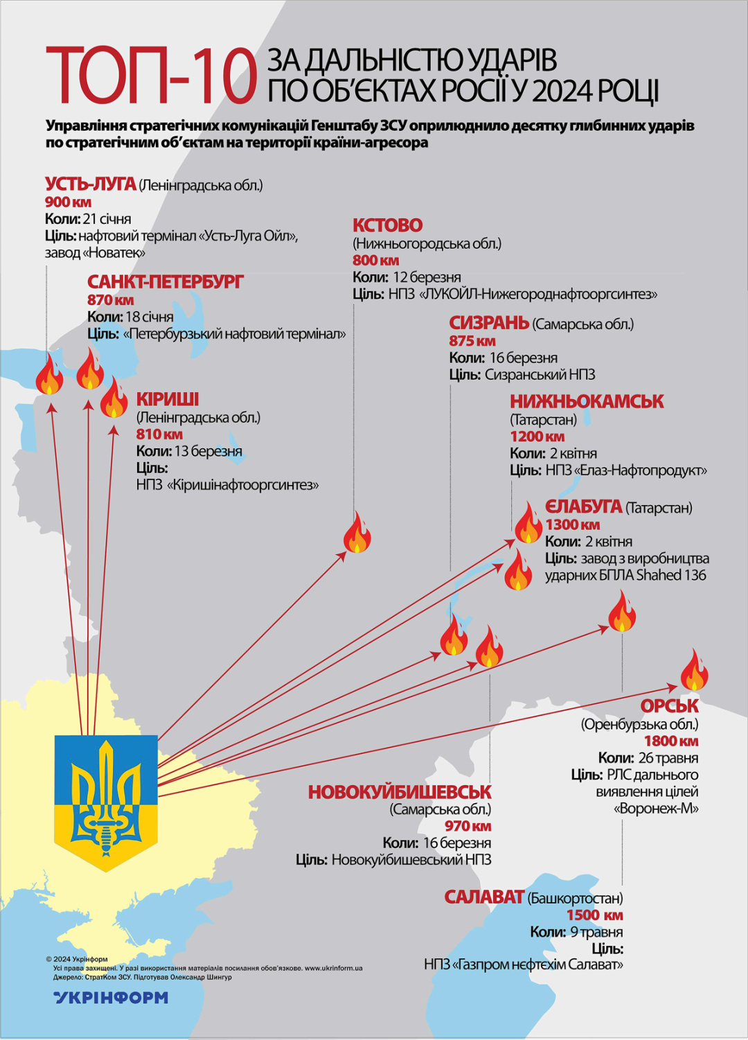 Топ-10 за дальністю ударів по об’єктах росії у 2024 році