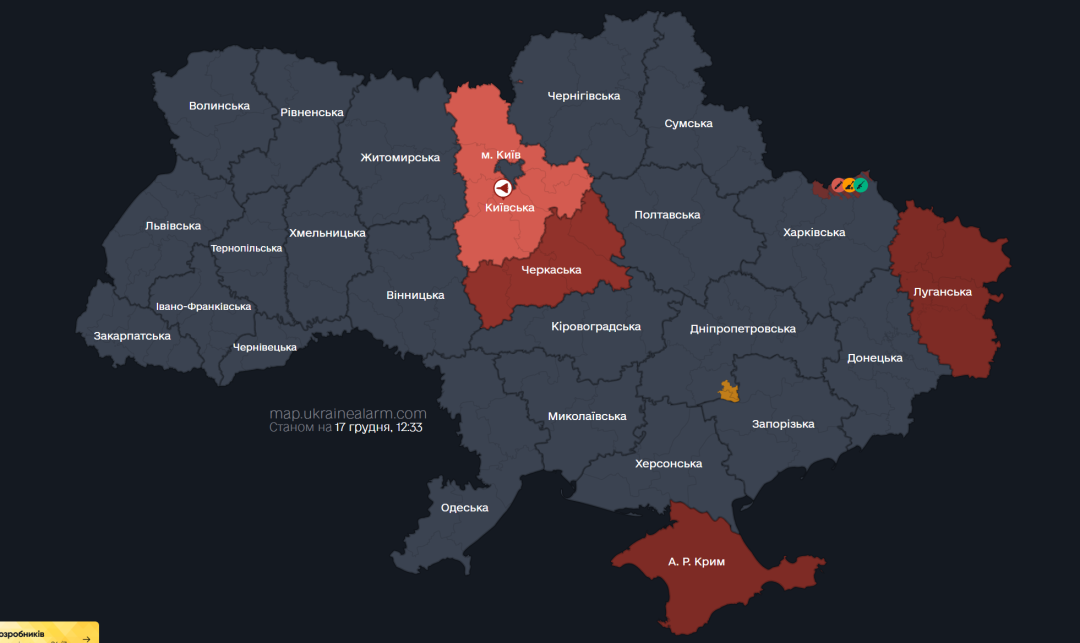 Як повідомляв Укрінформ, зранку у вівторок, 17 грудня, у Києві та низці областей оголошували повітряну тривогу через загрозу ворожих дронів.