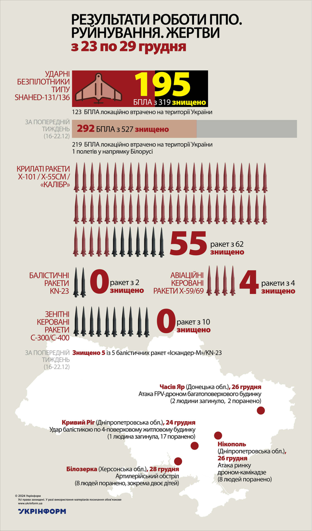Внаслідок обстрілів російськими окупантами з 23.12 по 29.12 Донецької, Херсонської, Сумської, Запорізької, Дніпропетровської та Харківської областей 12 людей загинуло, 56 отримали поранення.