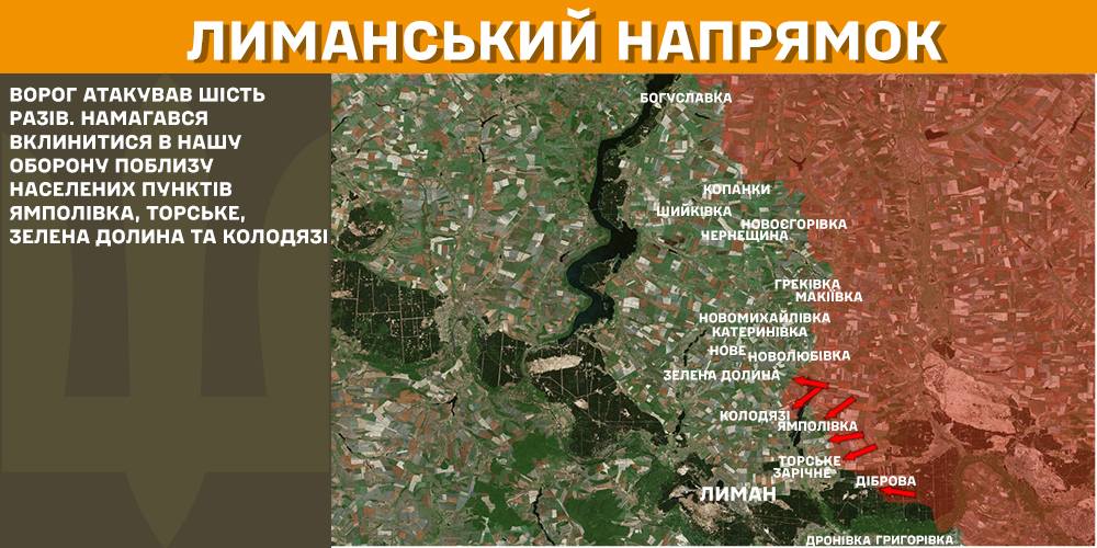 На Лиманському напрямку війська РФ атакували шість разів, намагались вклинитися в оборону поблизу Ямполівки, Торського, Зеленої Долини та Колодязів.