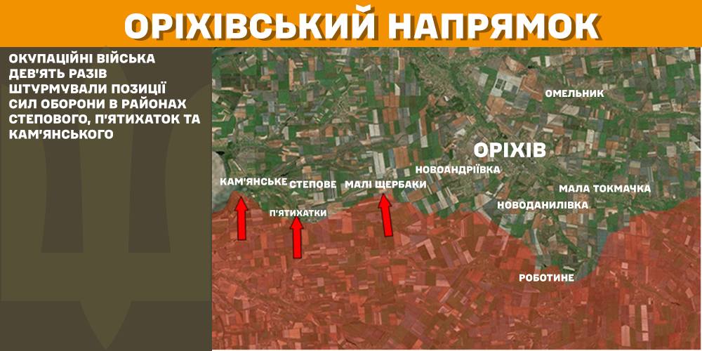 На Оріхівському напрямку російські війська дев’ять разів штурмували позиції Сил оборони в районах Степового, П’ятихаток та Кам’янського.