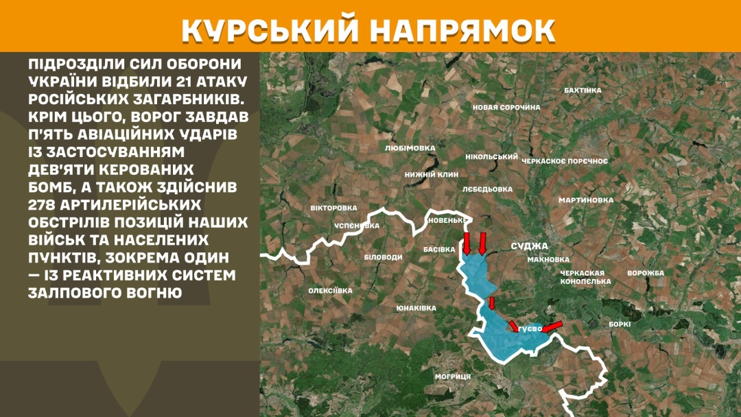 В операційній зоні в Курській області РФ підрозділи Сил оборони відбили 21 атаку росіян. Ворог завдав п’ять авіаційних ударів із застосуванням дев’яти керованих бомб, а також здійснив 278 артилерійських обстрілів позицій українських військ і населених пунктів, зокрема один — із реактивних систем залпового вогню.