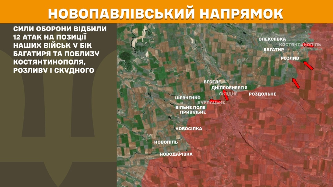 На Новопавлівському напрямку Сили оборони відбили 12 атак у бік Багатиря і поблизу Костянтинополя, Розливу і Скудного.