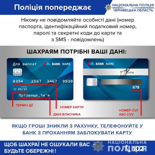 Правоохоронці Головного управління Національної поліції у Чернівецькій області, закликають громадян не довіряти незнайомцям в інтернеті, не переходити за сумнівними посиланнями та в жодному випадку не вводити конфіденційну інформацію, що стосується ваших банківських рахунків.