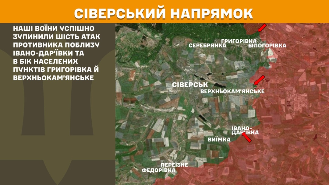 На Сіверському напрямку українські воїни зупинили шість ворожих атак поблизу Івано-Дар’ївки та у бік Григорівки і Верхньокам’янського.