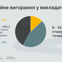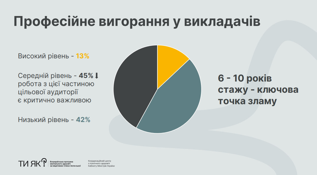 Лише 42% викладачів мають низький рівень вигорання. У 45% він середній – це сигнал про необхідність профілактики погіршення стану. У 13% – високий рівень емоційного та фізичного виснаження, що проявляється в постійній втомі, байдужості до роботи та втраті мотивації. Критичним періодом для фахівців виявився стаж 6-10 років.