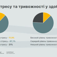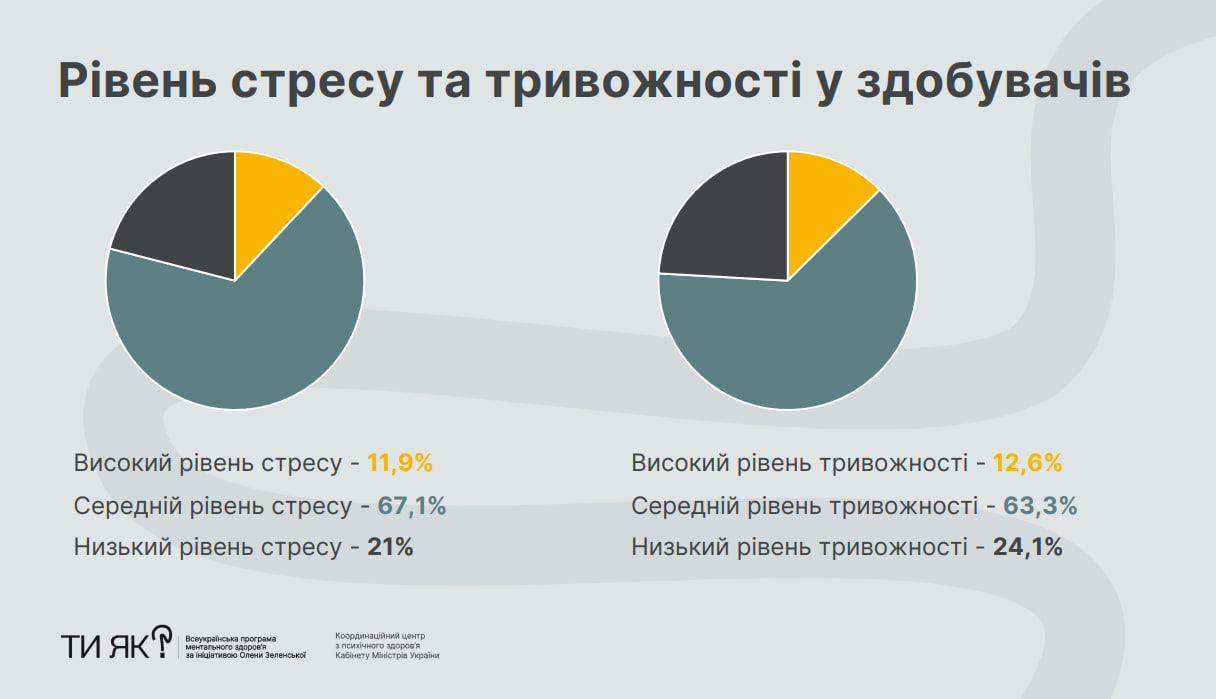 У студентів ситуація подібна. Більшість – 67,1% – відчувають середній рівень стресу, 11,9% – значний. Тривожність також висока: у 13% – на критичному рівні, понад 63% – на середньому.