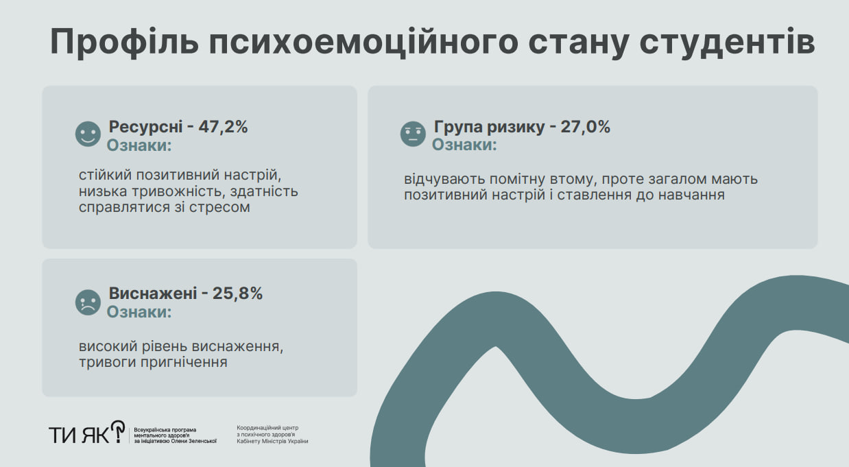 На основі результатів сформовано психоемоційний профіль здобувачів освіти: майже половина з них (47,2%) належать до «ресурсної» категорії, 27% – до «групи ризику», 25,8% – до «виснажених», яким уже зараз потрібна психосоціальна підтримка.