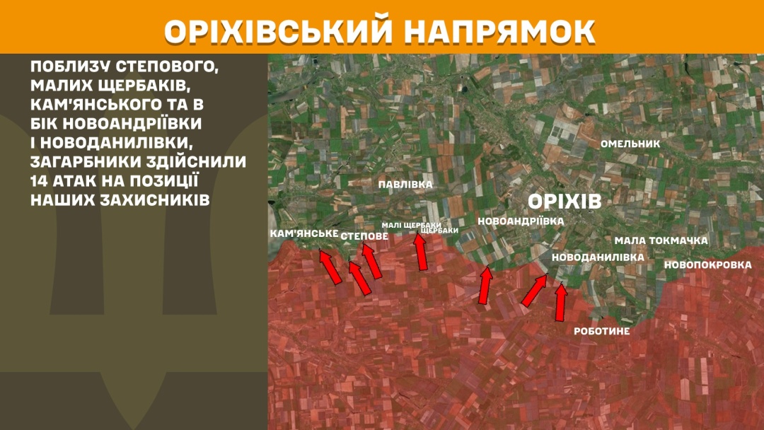 На Оріхівському напрямку поблизу Степового, Малих Щербаків, Кам’янського та в бік Новоандріївки і Новоданилівки загарбники здійснили 14 атак.