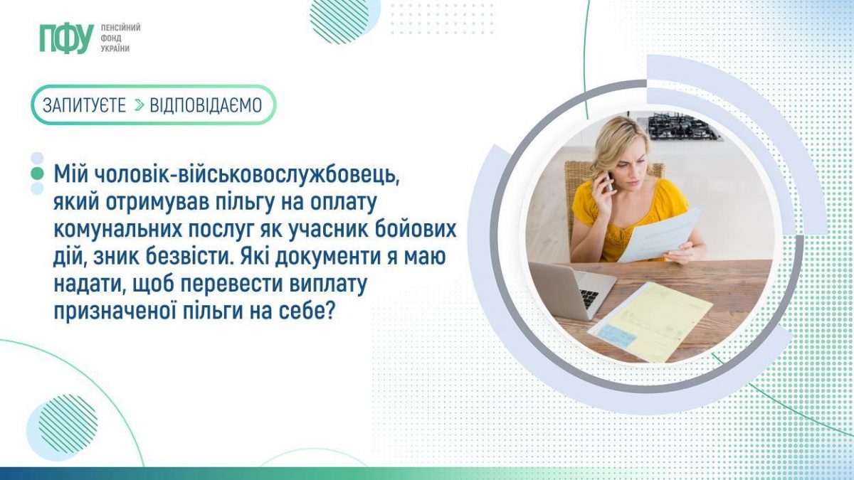 Мій чоловік-військовослужбовець, який отримував пільгу на оплату комунальних послуг як учасник бойових дій, зник безвісти. Які документи я маю надати, щоб перевести виплату призначеної пільги на себе?