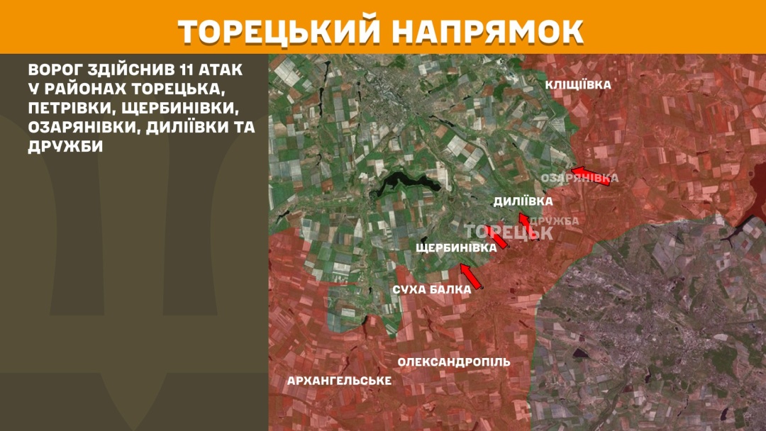 На Торецькому напрямку ворог здійснив 11 атак у районах Торецька, Петрівки, Щербинівки, Озарянівки, Диліївки та Дружби.