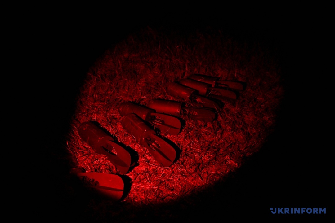 Із посадки виходять дві тіні із червоними ліхтариками. Швидко, без привітань починають вивантажувати БК. Я прошу не поспішати, щоб сфотографувати вивантаження. Але один із них вказує мені на відомий усім маршрут. Після цього ми з пресофіцером спускаємось до бліндажа, де за хвилину опиняється й увесь екіпаж.