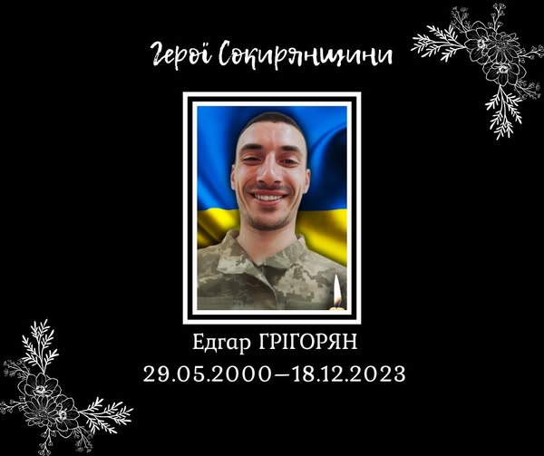 Солдат Едгар Грігорян загинув 18 грудня 2023 року біля села Богданівка Бахмутського району Донеччини. У бою з ворогом отримав смертельне кульове поранення голови. Воїну назавжди залишилось 23 роки.